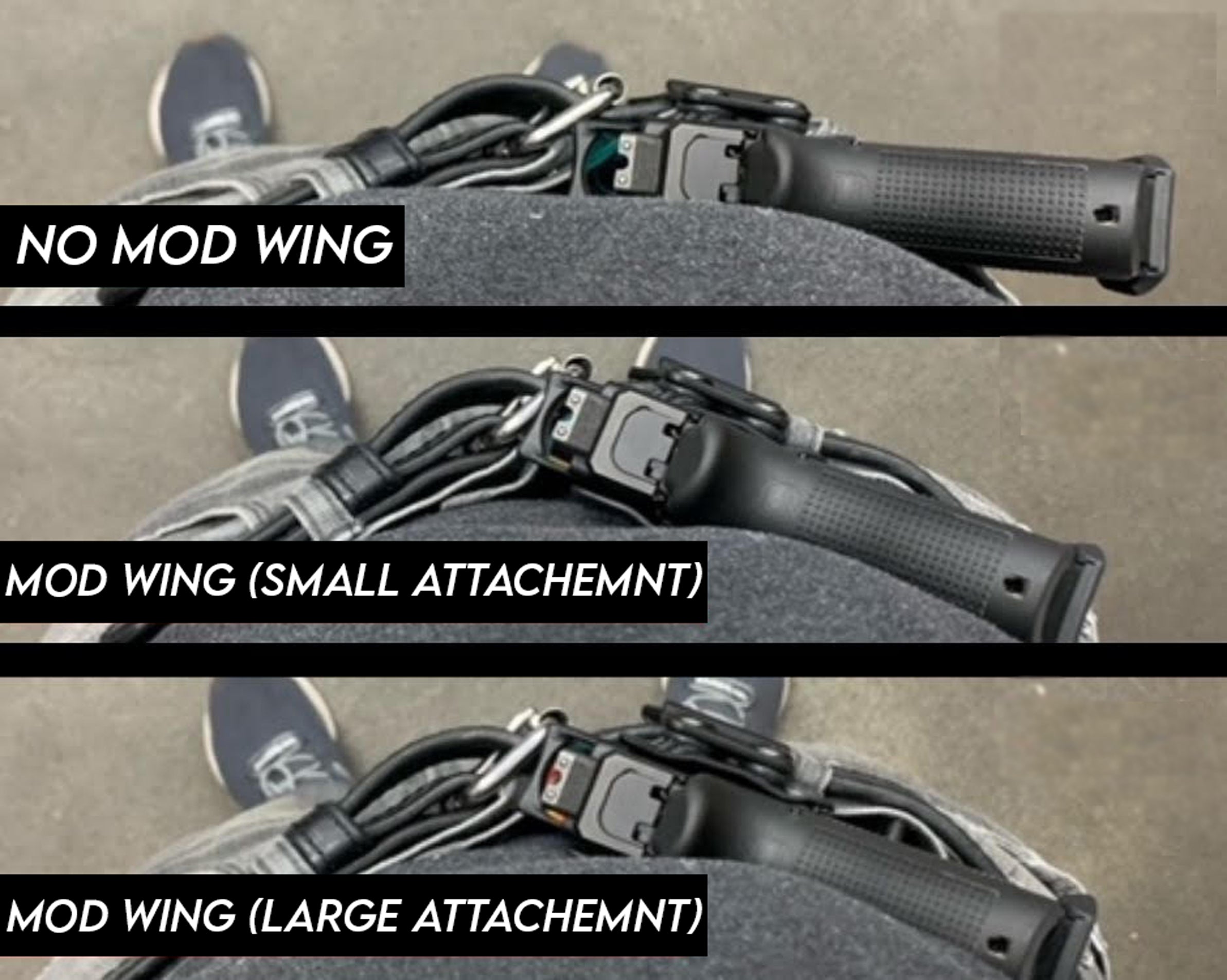 What is a Mod Wing? - The optional Mod Wing attachment allows your firearm to be concealed even better! The Mod Wing works by making contact with the back side of your belt and pants which pulls the grip of your firearm closer to your body.