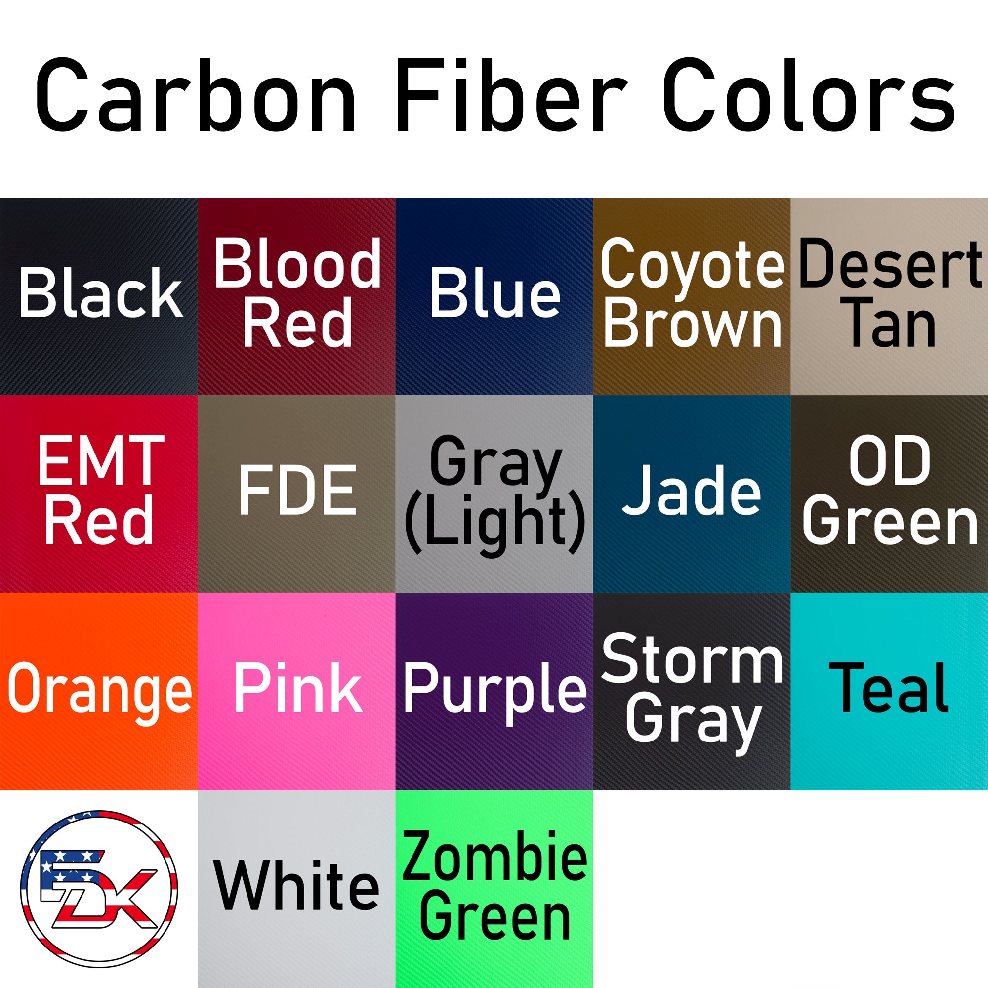 Regarding our printed holsters, the default material is carbon fiber-textured Kydex, unless otherwise stated. It's important to note that during the printing process, there may be slight variations in color, and the interior color of the holster could differ depending on the selected design.